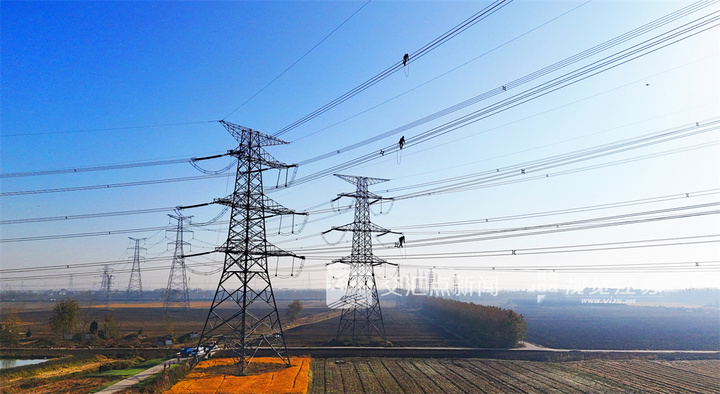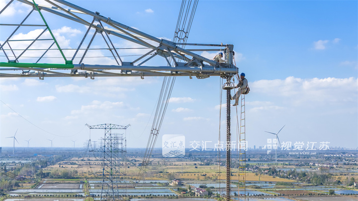 11月12日,连云港市赣榆区墩尚镇,国网连云港供电公司工作人员正在对500千伏艾湖线进行走线检修,有效保障迎峰度冬期间正常的生产生活用电平稳有序。耿玉和/摄 视觉江苏网供图
