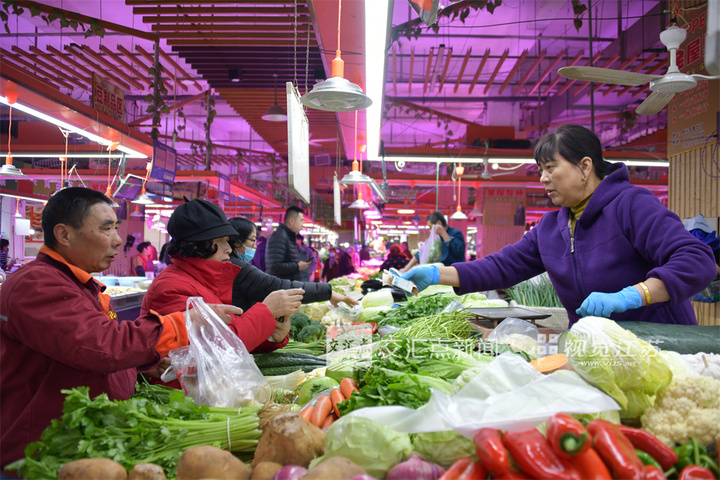 11月17日,淮安市洪泽区高良涧街道一家农贸市场“菜篮子”供应品种丰富、价稳量足,市民正在选购。崔德圣/摄 视觉江苏网供图
