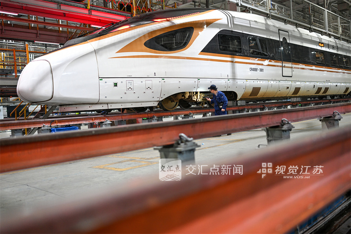 11月15日,在南京动车段南京南动车运用所检修库,地勤机械师对车体外表进行检查。方东旭/摄 视觉江苏网供图