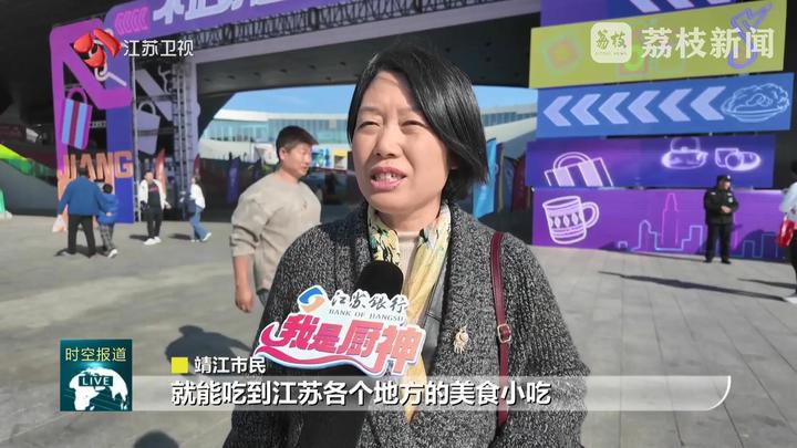 荔枝新闻中心记者范洁萍说:“我们现在所在的位置就是泰州靖江文化中心了,我们这片区域就是‘苏味风华集’。看看我们现场的人气有多火爆,真是把我看饿了,大伙吃着逛着手上还拎着。”