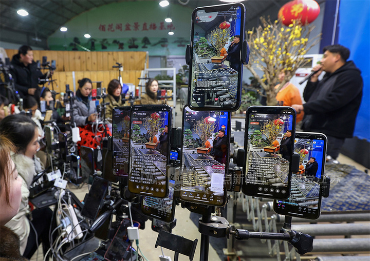 《坐销四海》 1月14日,在沭阳县新河镇百花阁盆景直播基地,几十位主播赶着夜色参加“矩阵直播”,场面壮观。“花木之乡”沭阳县花木种植面积达六十万亩,从业人员超三十五万人,各类花木电商突破五万家,成功走出一条“互联网+三农”的发展模式。 赵亚玲 摄