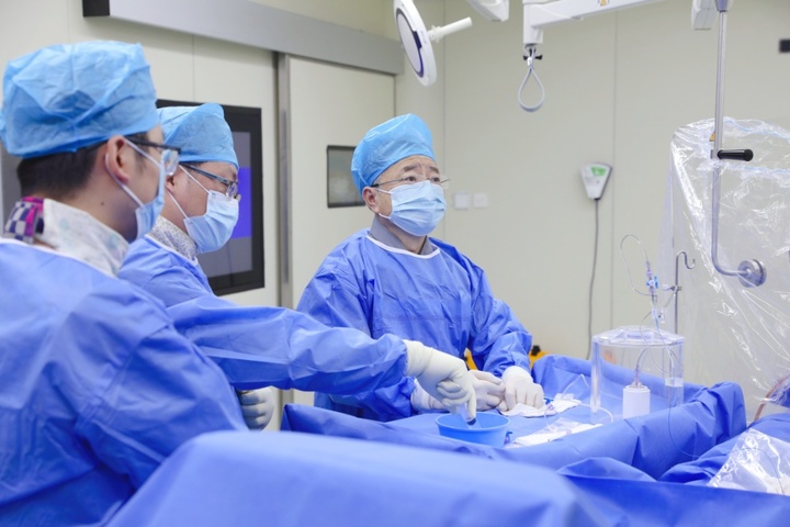 与此同时,高精尖医疗技术也在江苏落地生根、走向常态。2023年3月24日,60岁的李阿姨在东南大学附属中大医院接受了一场特殊手术——她因结直肠癌肝转移,由滕皋军院士带领的介入与血管外科团队,为其施行了全球首例钇90炭微球治疗。手术中,数百万颗载有同位素钇90的微球,如精准投放的“核弹”,经肝动脉注入肿瘤内部,局部释放高剂量辐射,高效杀灭癌细胞。整个过程仅耗时40多分钟,十分顺利。