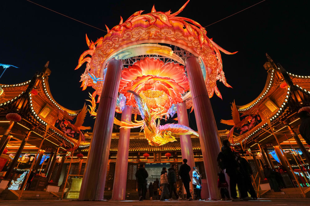 市民游客在南京市秦淮区夫子庙大成殿景点参观各种灯彩(李博 摄)