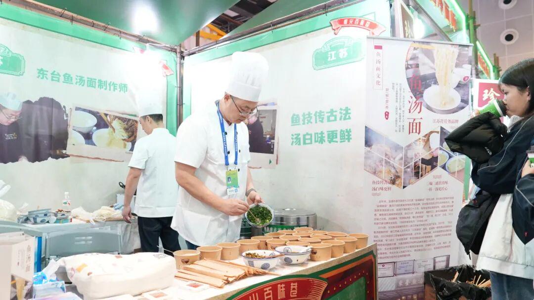 “请来一碗鱼汤面!”“鱼汤面还有吗?”“好,我们等下一锅!”……全国劳务协作暨劳务品牌发展大会现场,“东台鱼汤面制作师”展位前人流不断,江苏省级非遗代表性传承人徐用军现场烹制的面食供不应求,一天半时间已免费供应近2000份鱼汤面,有不少游客在2个多小时的熬制期间仍甘愿等候。等候间隙,甚至有不少居民主动记录制作过程,还不时为 “盐城家政” 劳务品牌点赞喝彩。