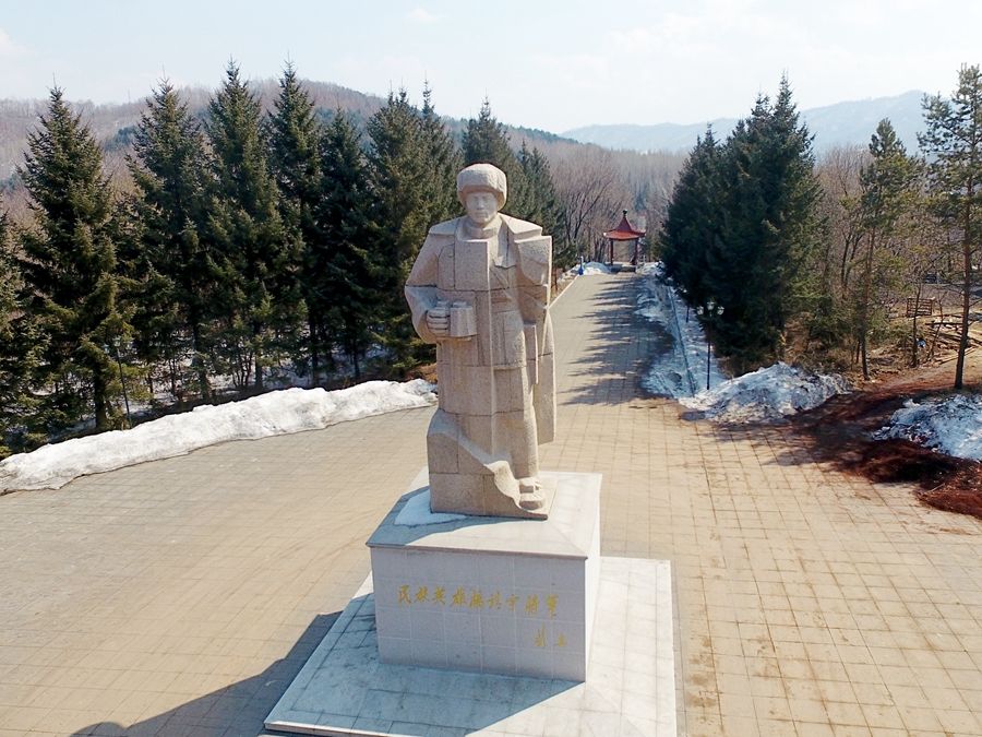 △矗立在吉林省靖宇县杨靖宇将军殉国地的杨靖宇雕像(2017年3月22日摄)。新华社记者 曾涛 摄