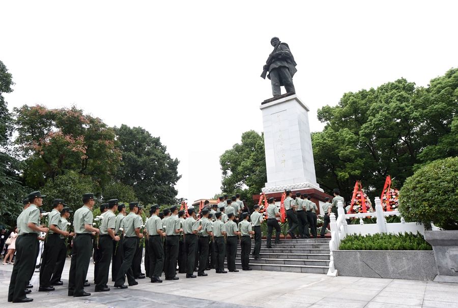 △在位于重庆市铜梁区的邱少云烈士纪念馆,武警官兵向邱少云烈士纪念碑献花(2017年9月30日摄)。新华社记者 唐奕 摄