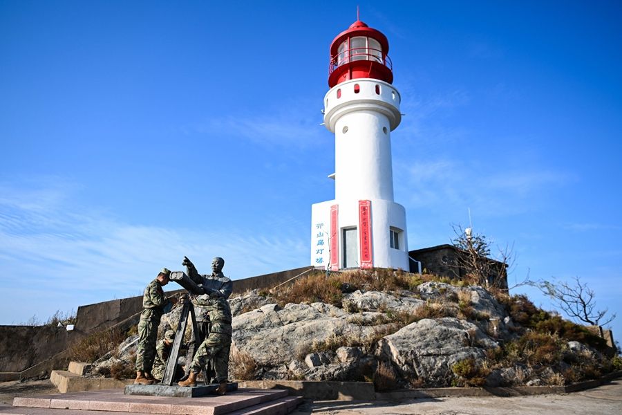 △开山岛守岛民兵保养清洁王继才雕像(2024年10月25日摄)。新华社记者 邓华 摄