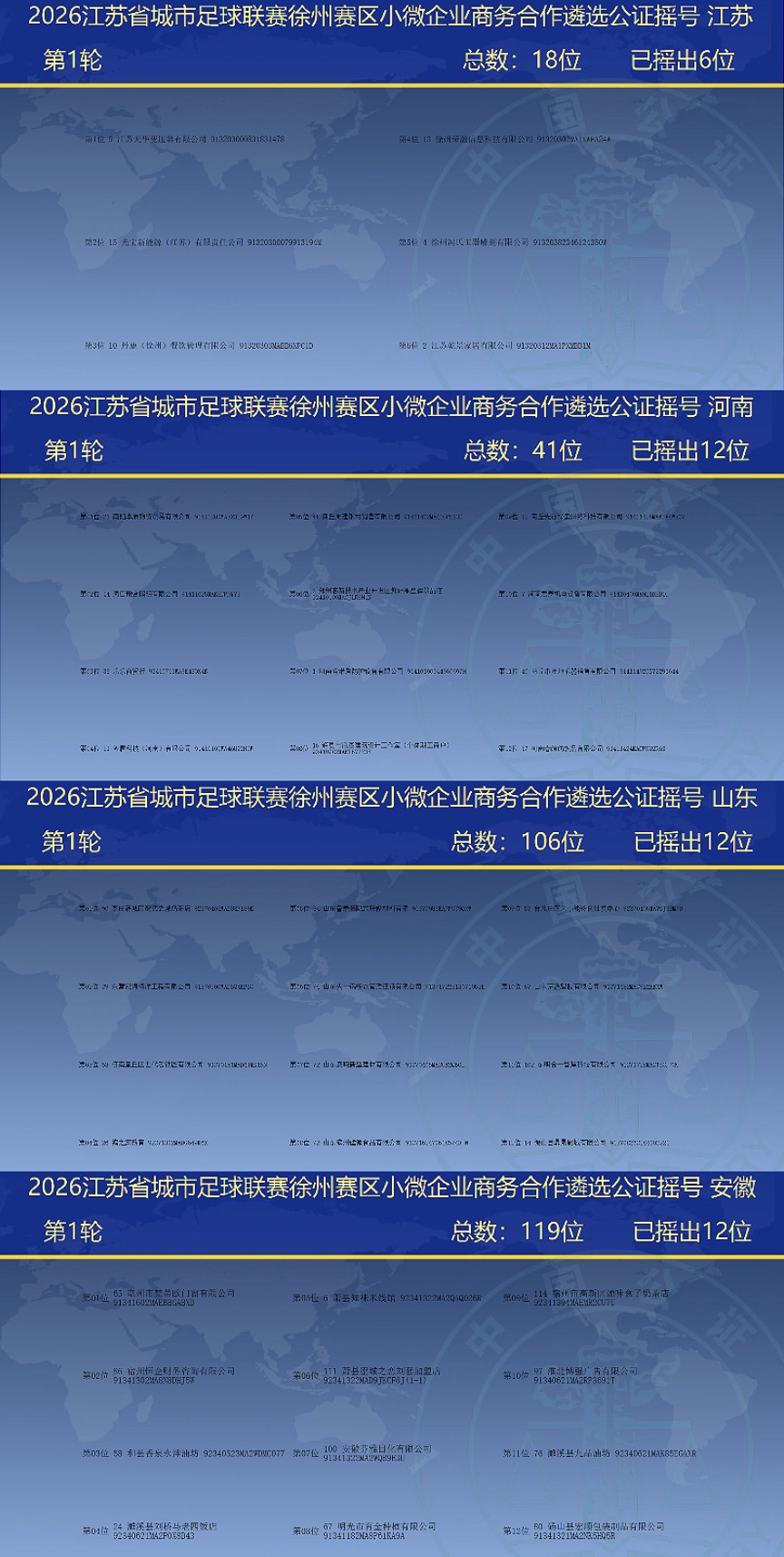 2026苏超(徐州)赛事小微企业合作遴选摇号3月31日举行,苏皖鲁豫四省284家企业参与,经公证处监督,按省份分轮摇出拟中选及备选企业。